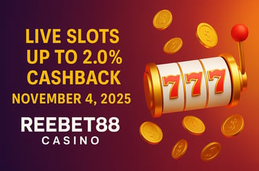 Make your November unforgettable with the Live Slots Up To 2.0% Cashback Event at REEBET88 CASINO! Spin your favorite slots, earn cashback, and celebrate the spirit of winning — because at REEBET88 CASINO, every spin counts toward something greater.